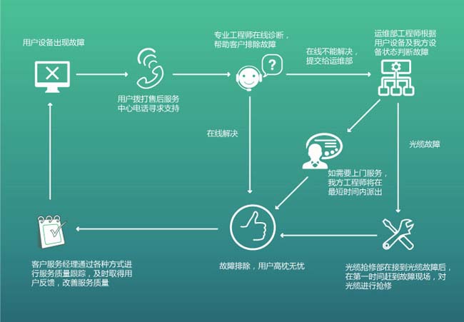 • 客服人员定期的进行电话询问线路使用情况(通常为一周一次),定期上门与相关人员沟通了解用户需求及意见(通常一月一次);• 双倍的线路中断赔偿为您带来更多信心;